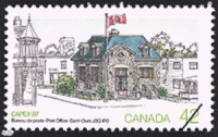 Our installations are located in St-Ours, Quebec a little town of 1609 poeples at 80km east from Montréal. Until 1992 our town was THE smallest town in Canada. We see at left a stamp representing our Post Office.